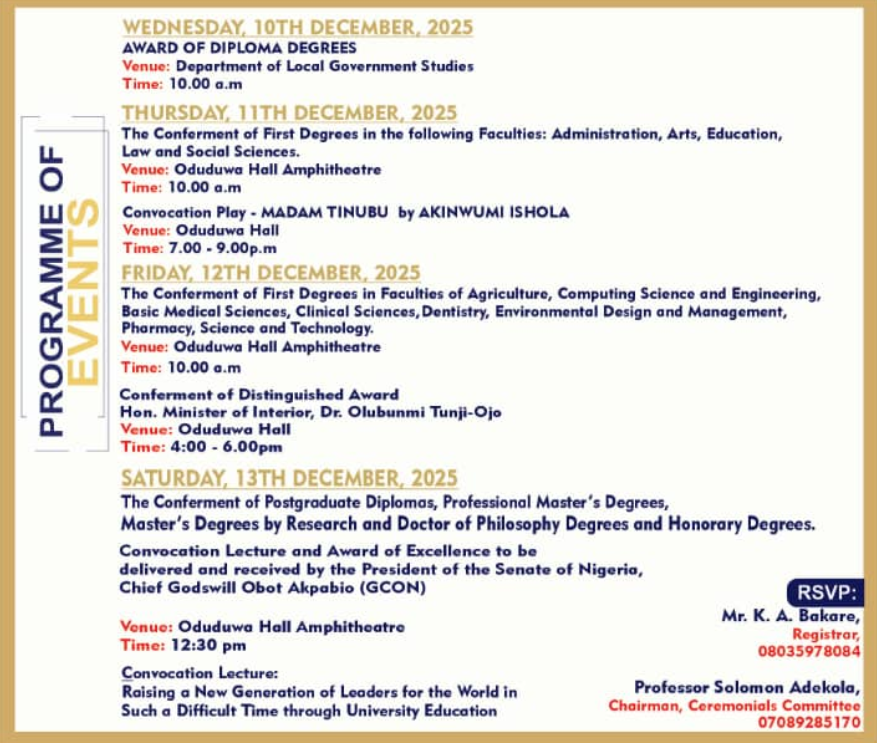 The Ceremonials Committee of Obafemi Awolowo University, Ile-Ife has unveiled the programmes for the University’s 49th Convocation scheduled to hold from Wednesday, 10th to Saturday, 13th December, 2025.